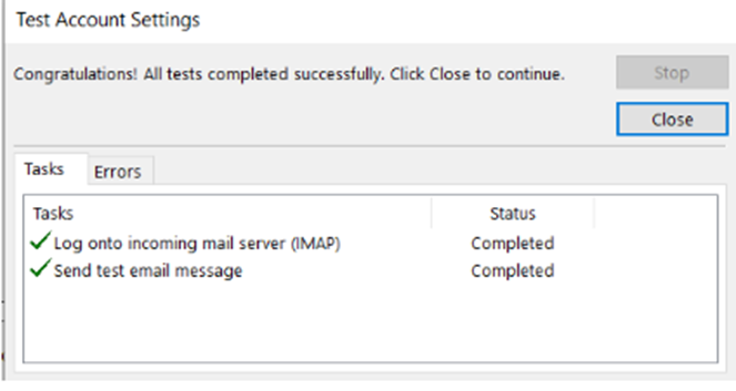 - Setelah selesai, Klik Next pada windows “Add Account Outlook”. Anda, akan melakukan validasi antara konfigurasi dengan server. Setelah validasi selesai Anda bisa memilih Close lalu pilih Next