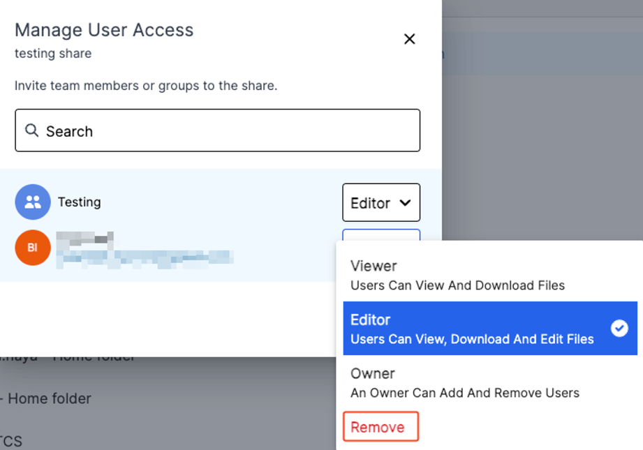 - Langkah Ke-sembilan : untuk remove user atau group dari folder pilih Manage Shares Kemudian klick (…) pada folder yang sudah di buat kemudian pilih Manage User Access