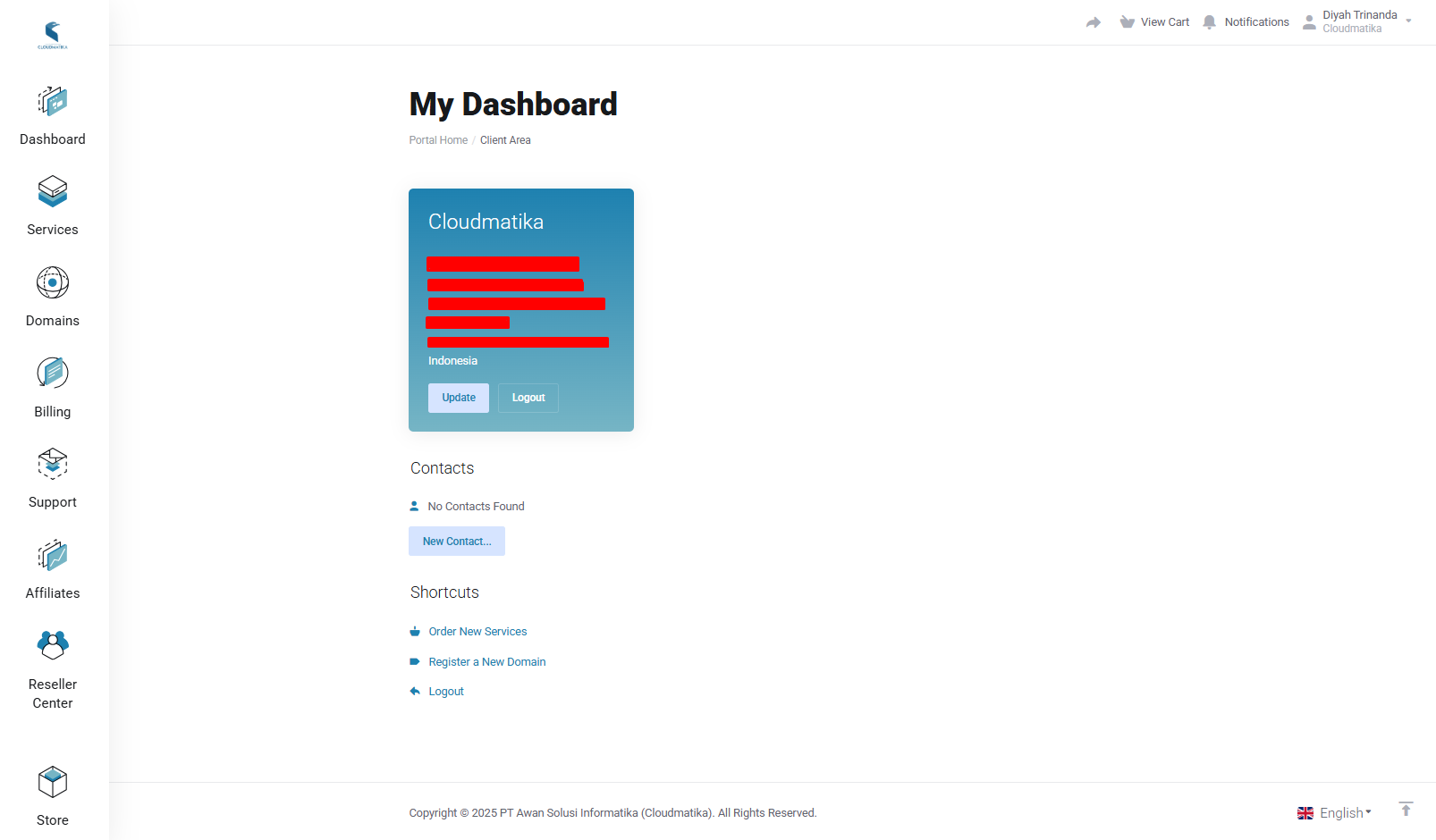 Untuk case seperti ini, yang awalnya hanya terdaftar atas satu user saja yang dapat login ke CCP, maka dapat dilakukan penambahan hak akses untuk user lainnya agar dapat login ke CCP yang berisikan informasi terkait layanan-layanan perusahaan tersebut di Cloudmatika. Untuk hal ini, silahkan menghubungi team Support Cloudmatika di support@cloudmatika.com agar dapat dibantu penambahan hak akses ke user lainnya.