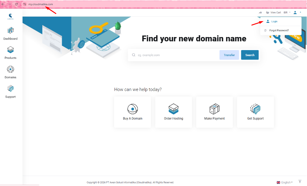 1. Login terlebih dahulu ke halaman CCP yaitu di https://my.cloudmatika.com/ :