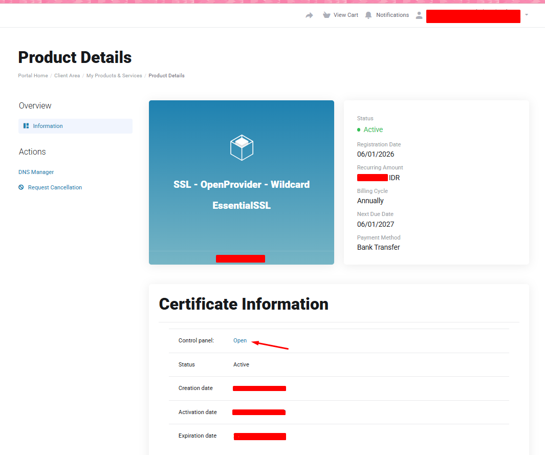 5. Silahkan klik "Open" untuk direct login menuju panel SSL :
